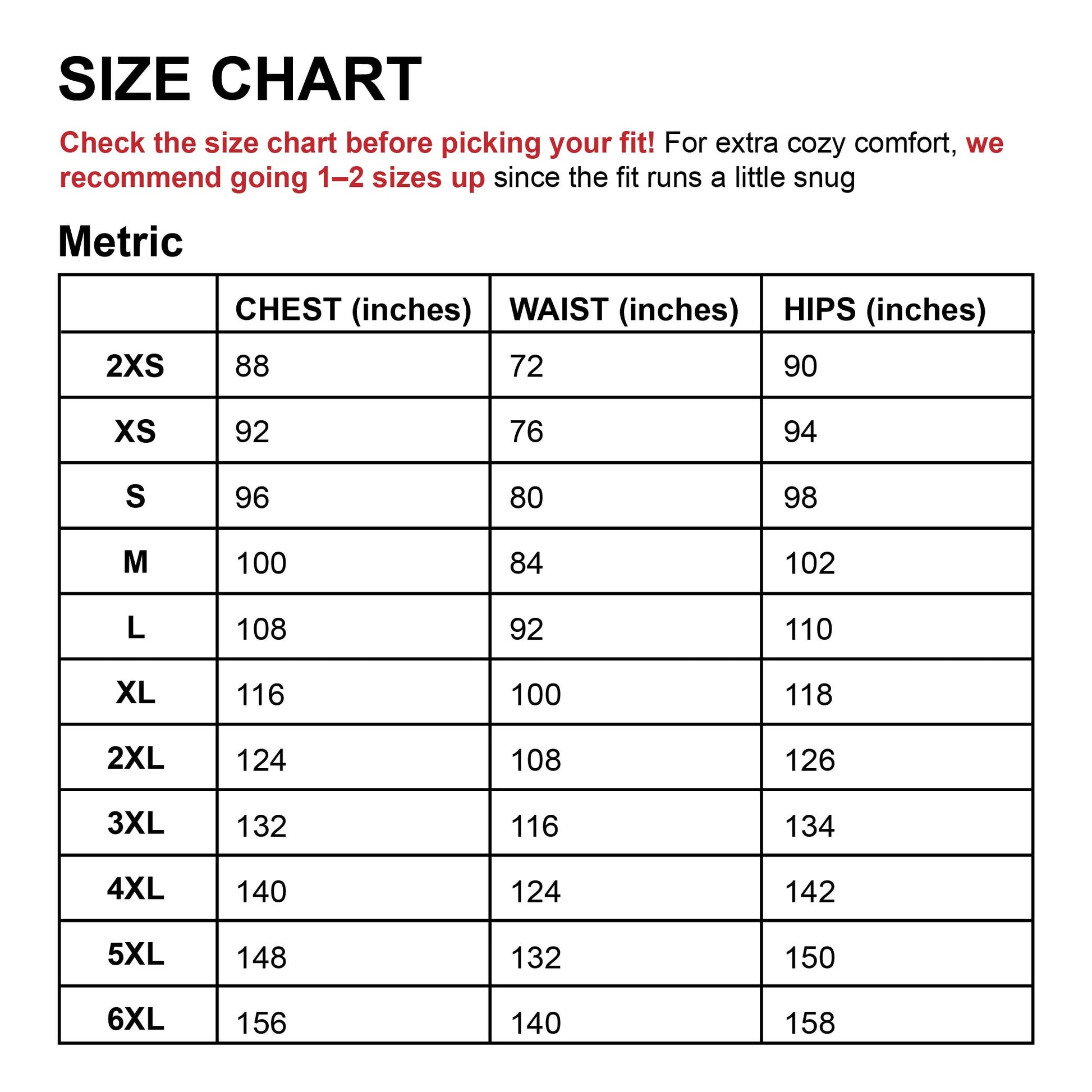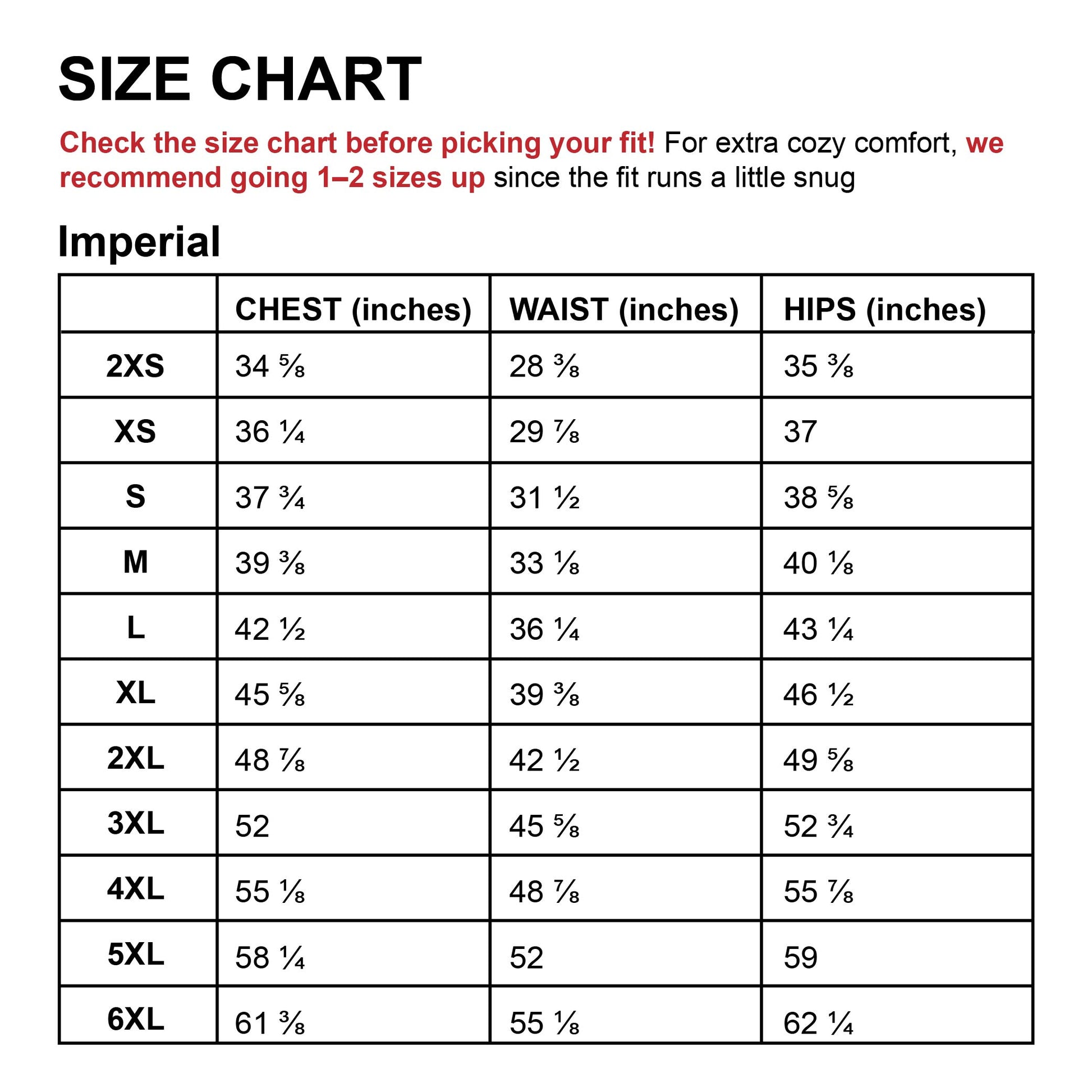 Check the size chart (in the images section) before picking your fit! For extra cozy comfort, we recommend going 1–2 sizes up since the fit runs a little snug.