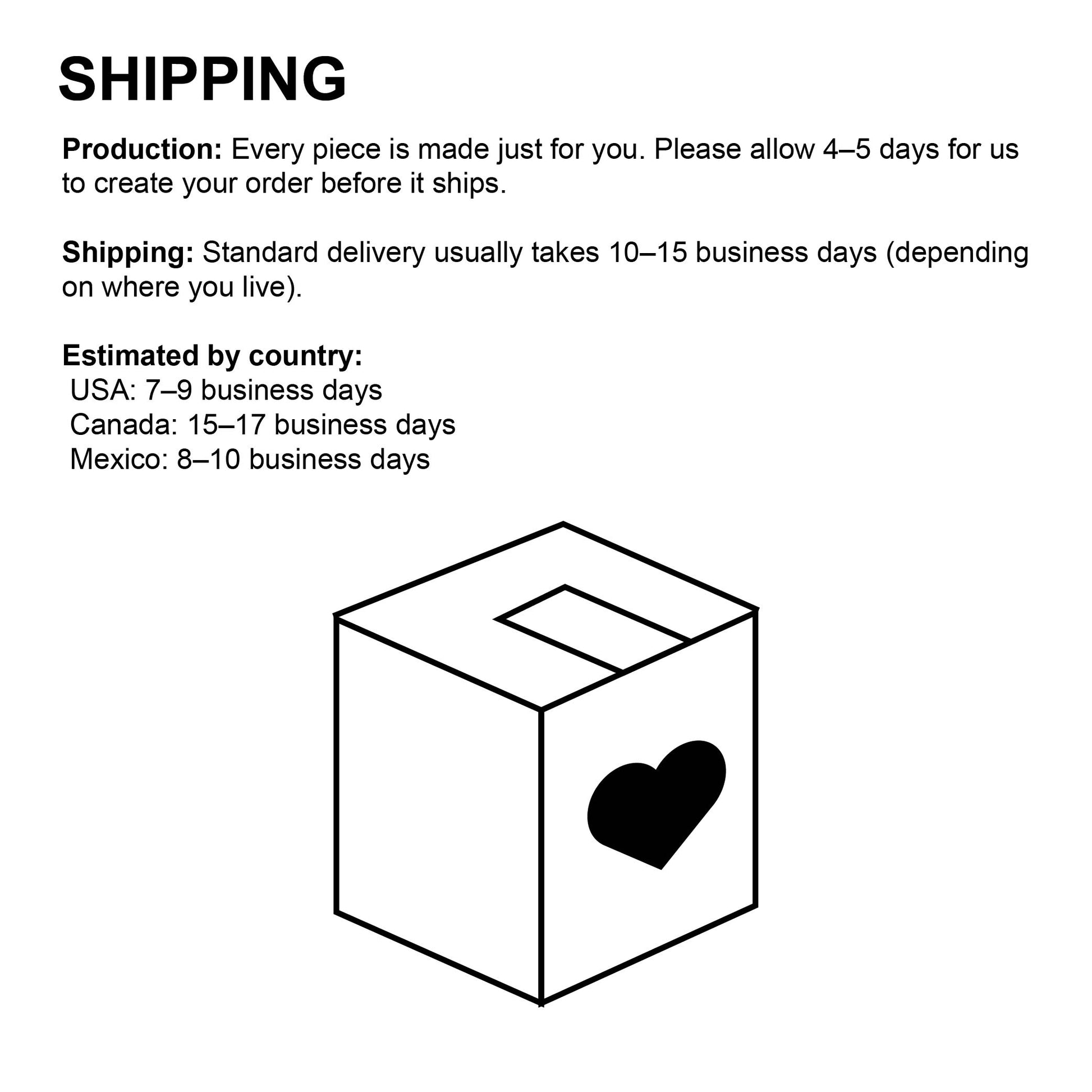 Every piece is made just for you. Please allow 2–7 days business days for us to create your order before it ships.